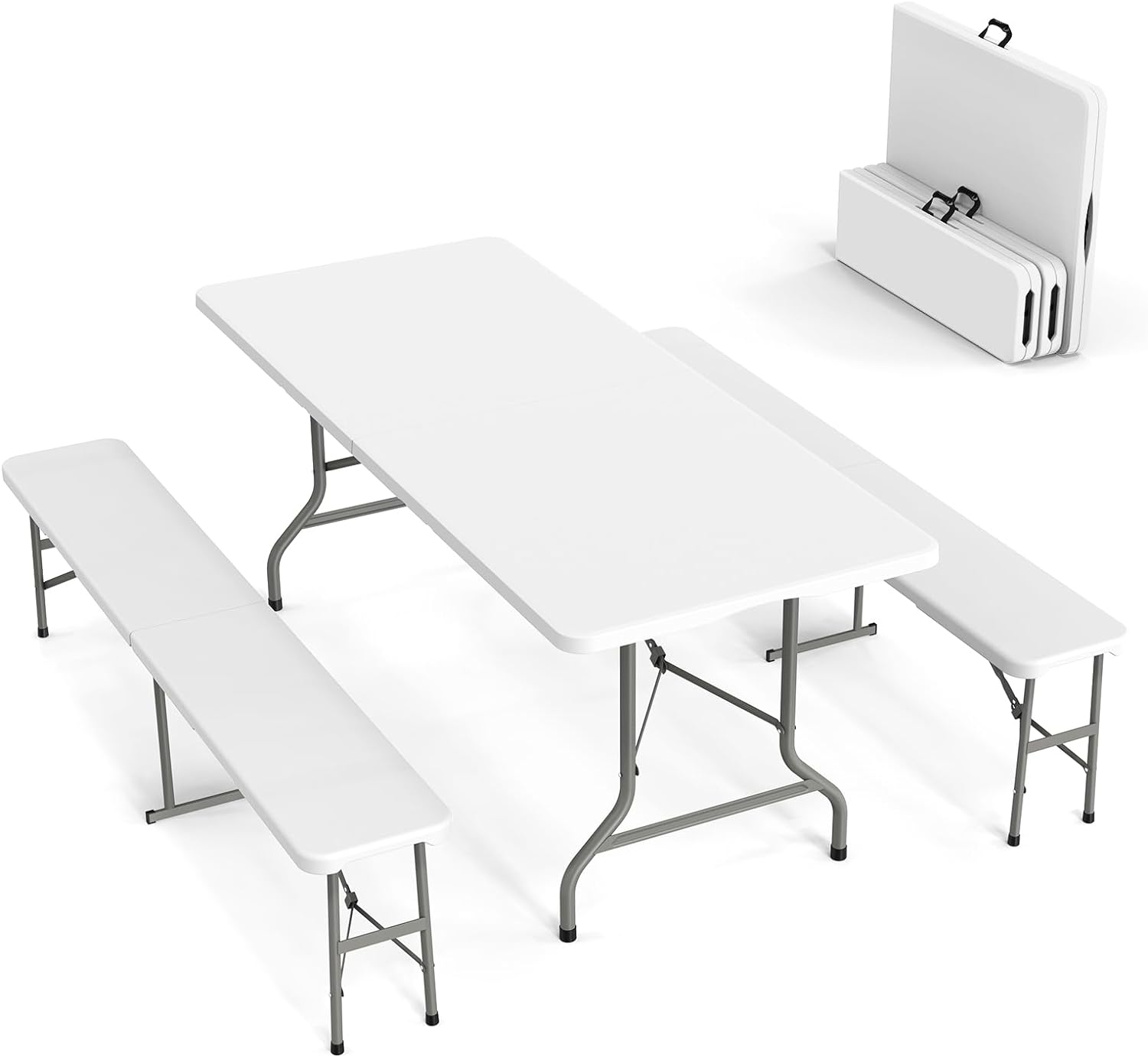 VINGLI Juego de mesa de picnic con 2 bancos, juego de sillas de mesa de camping de 6 pies, muebles plegables de 3 piezas para uso interior o exterior-taza