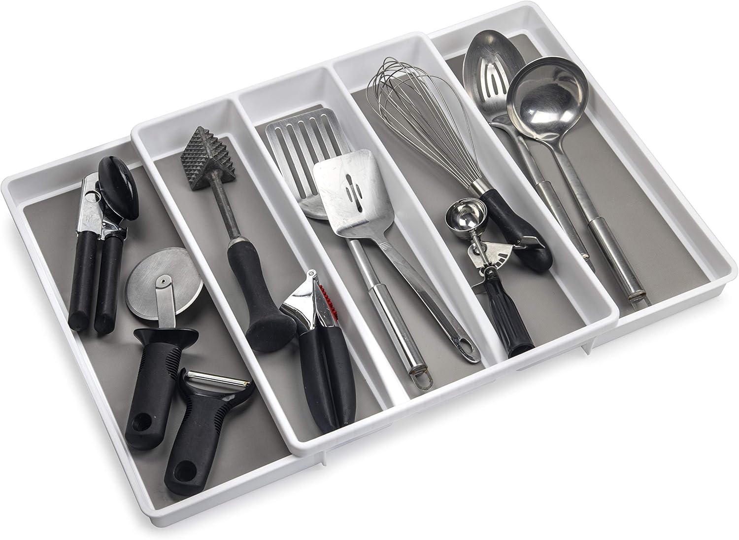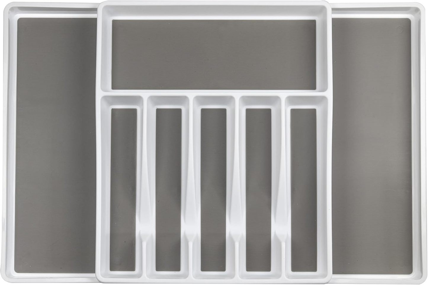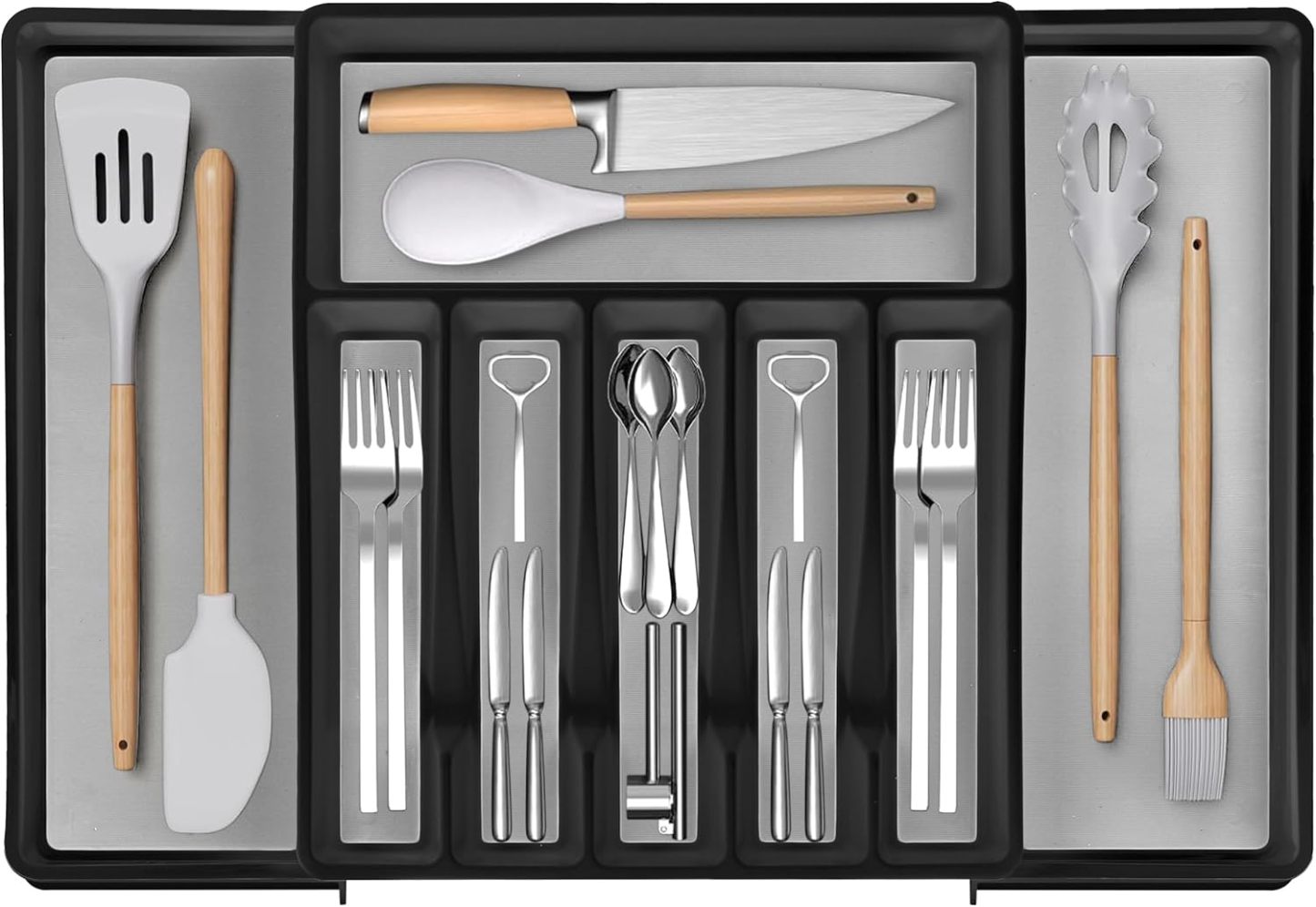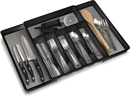 Diseño antideslizante y expandible: con bases antideslizantes y compartimentos expandibles, este juego se ajusta para satisfacer tus necesidades de cocina. La bandeja de cubiertos se expande de 6 a 8 compartimentos, mientras que la bandeja de utensilios se expande de 3 a 5 compartimentos grandes