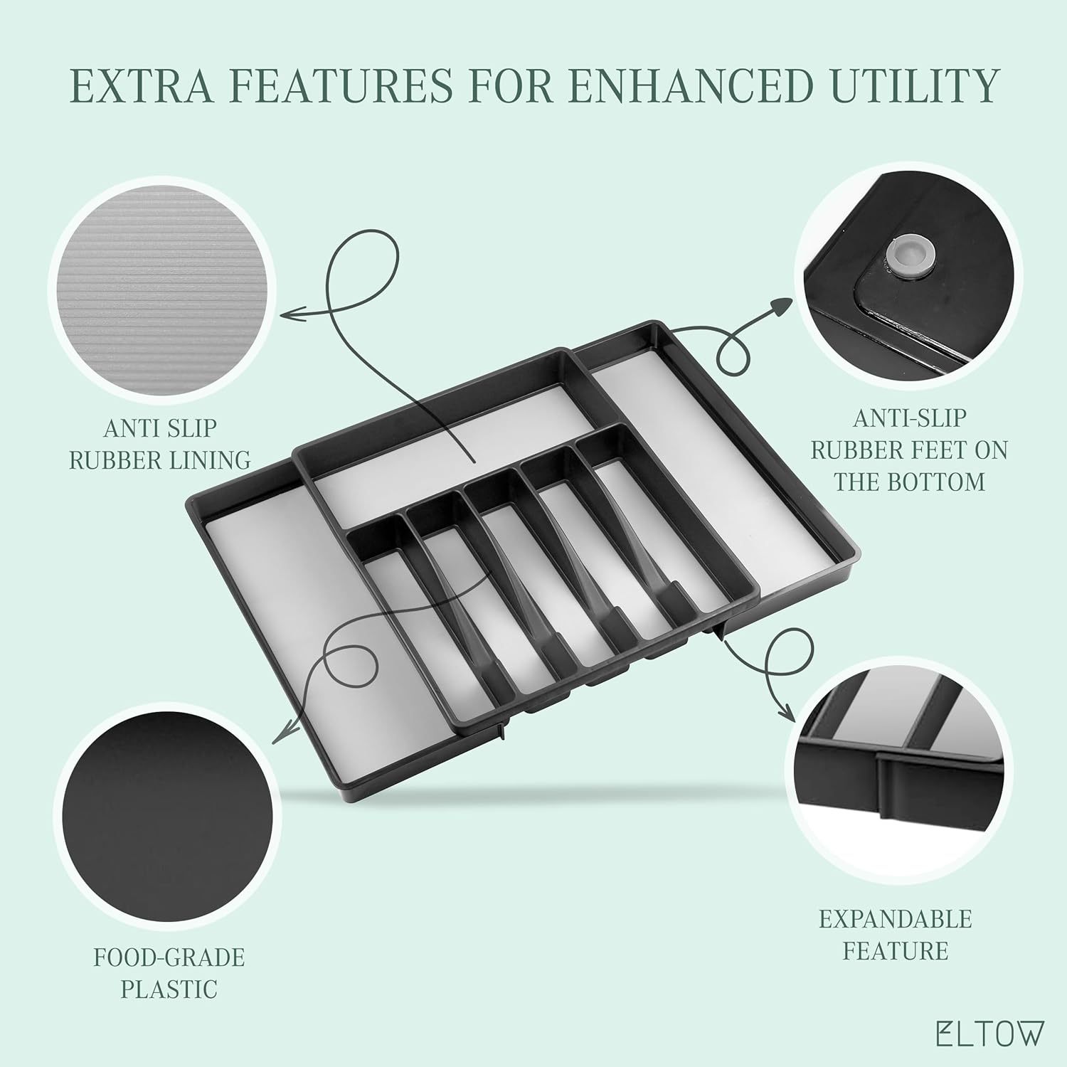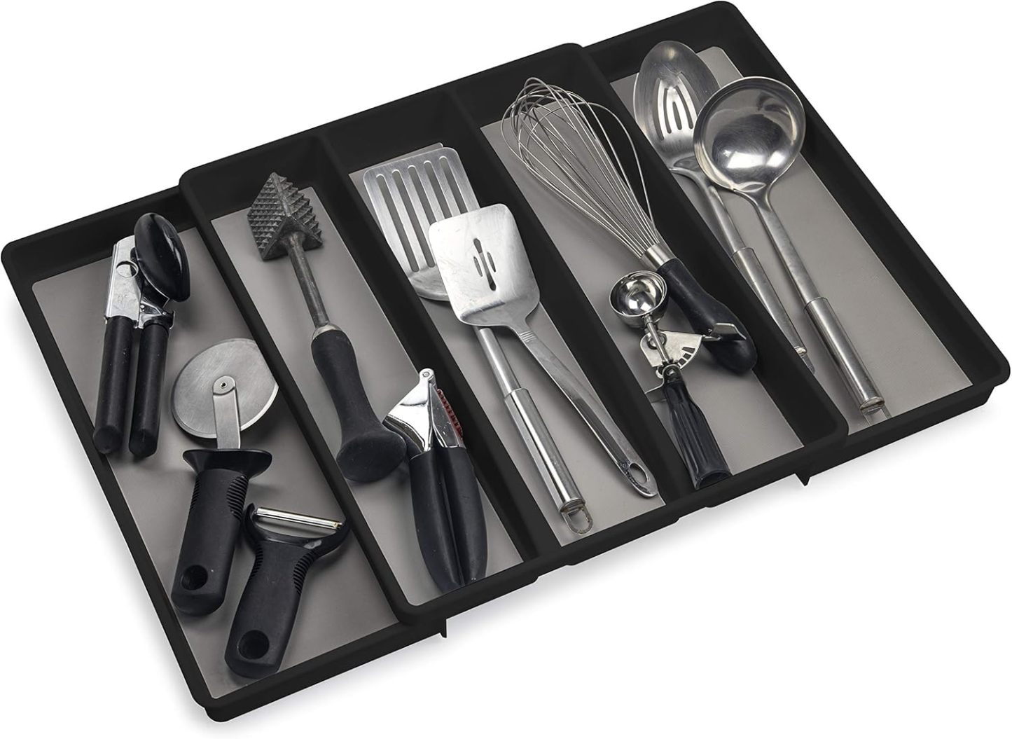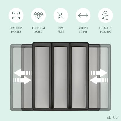 Diseño antideslizante y expandible: con bases antideslizantes y compartimentos expandibles, este juego se ajusta para satisfacer tus necesidades de cocina. La bandeja de cubiertos se expande de 6 a 8 compartimentos, mientras que la bandeja de utensilios se expande de 3 a 5 compartimentos grandes