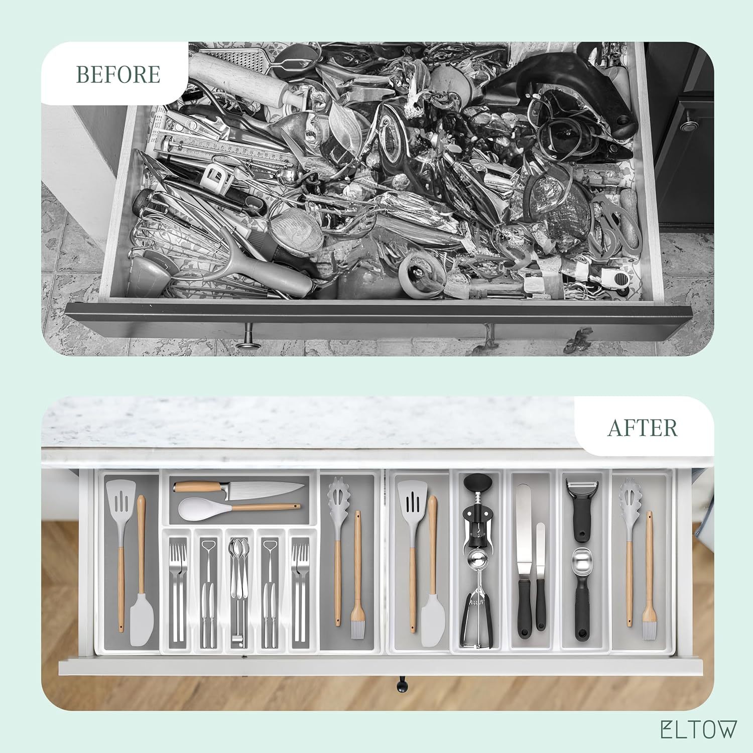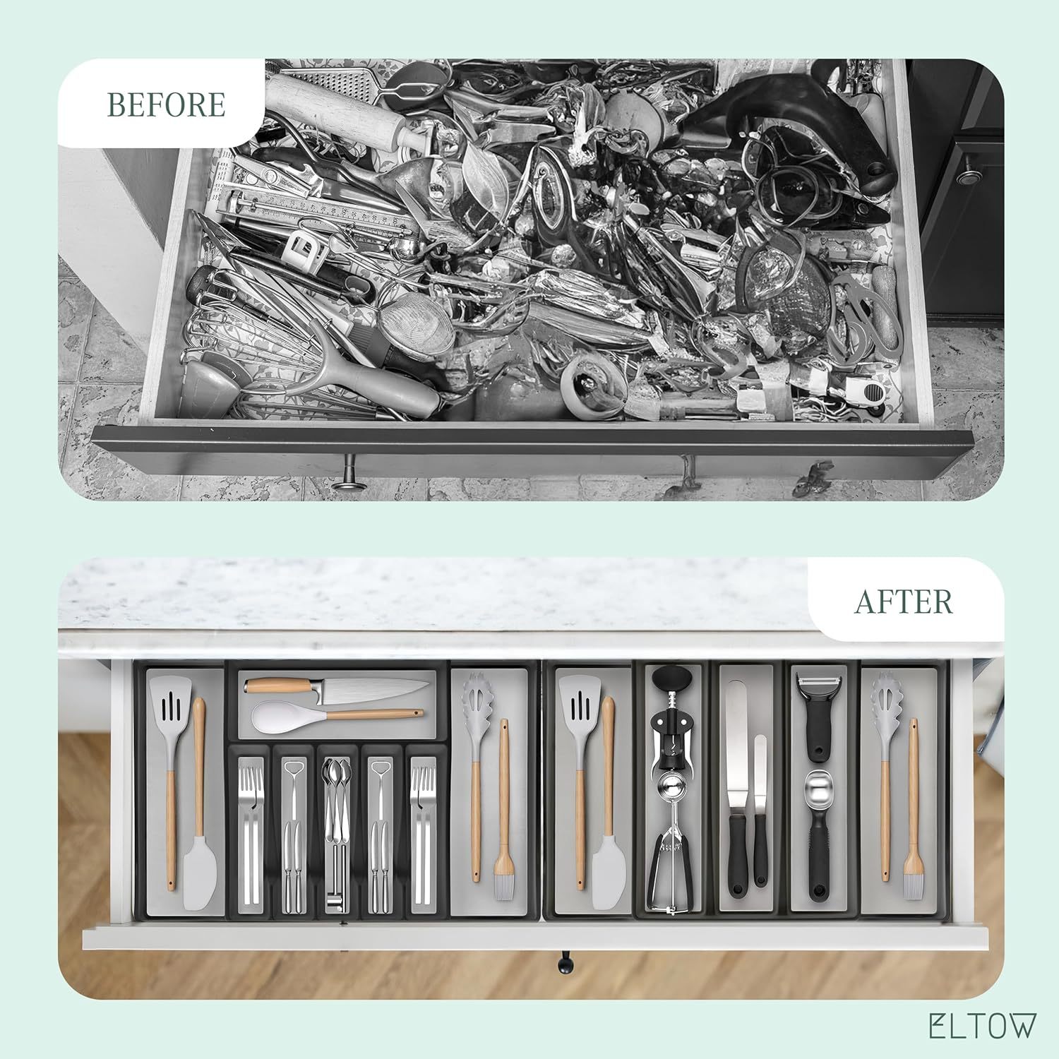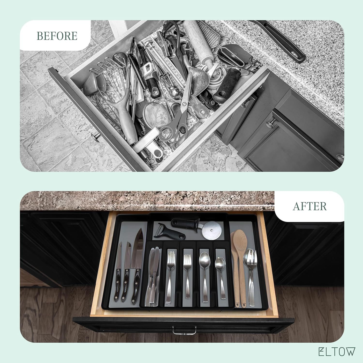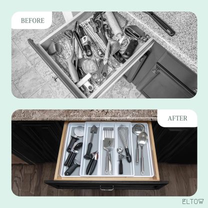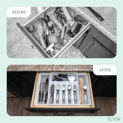 Es hora de que tengas tus cajones de cocina en perfecto orden, de una vez por todas. El soporte para cubiertos y utensilios Eltow de 2 piezas te mostrará cómo