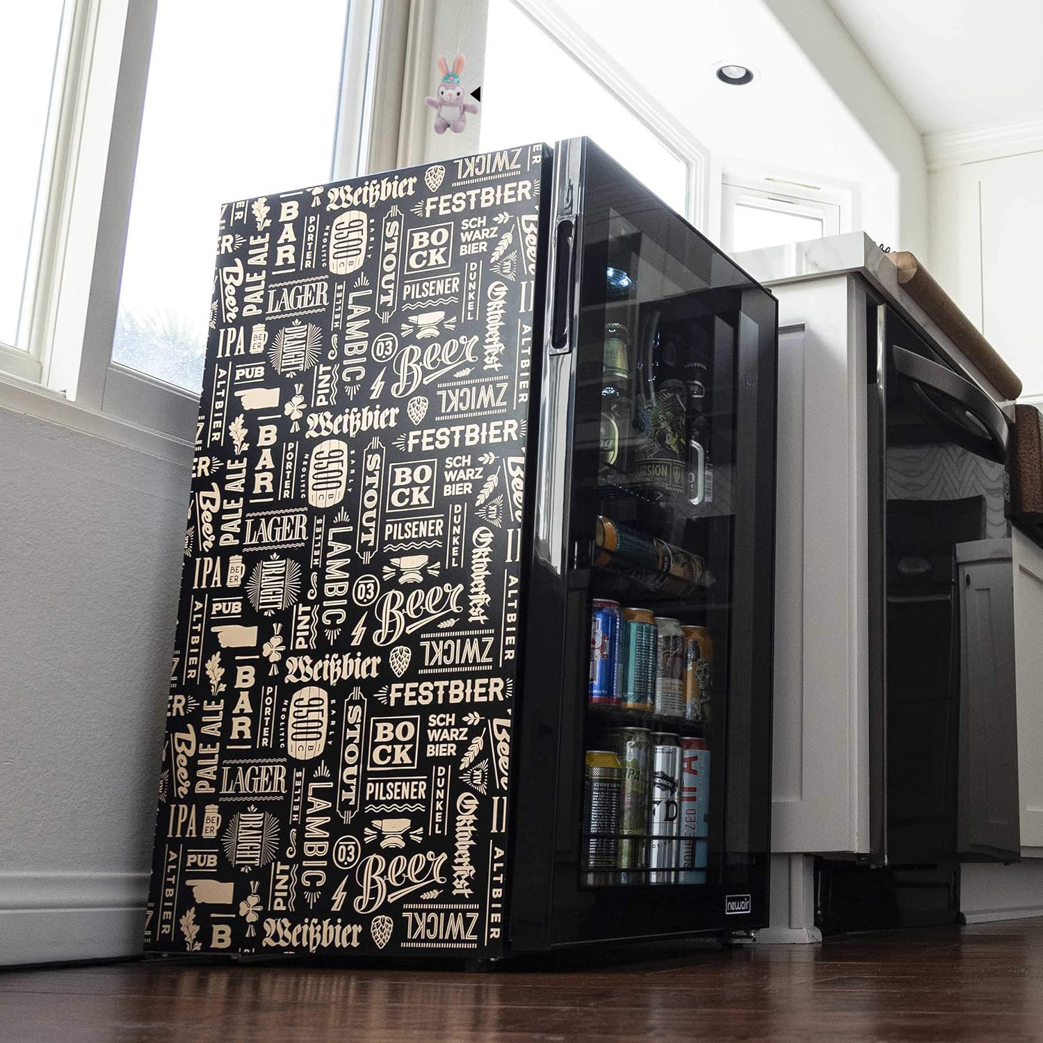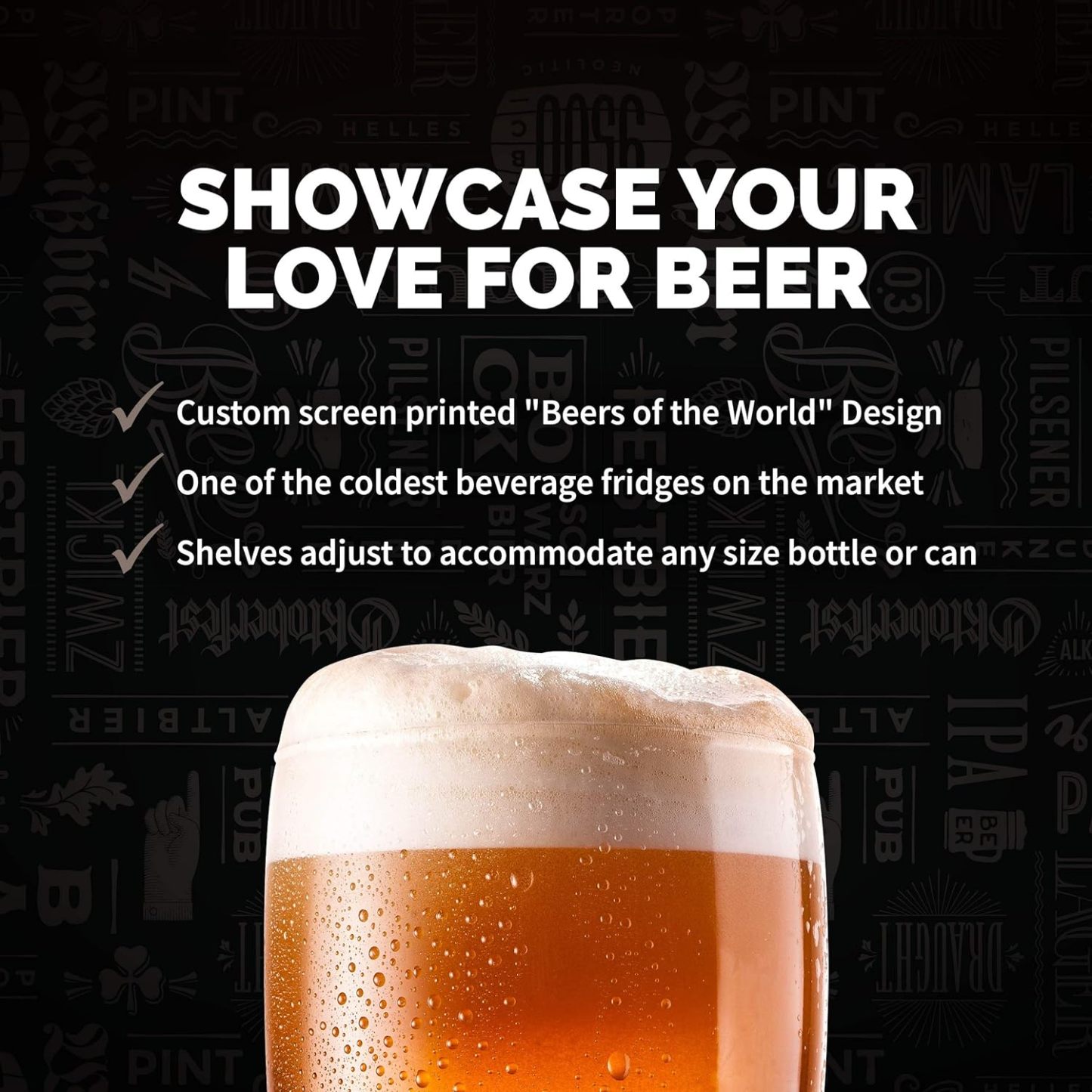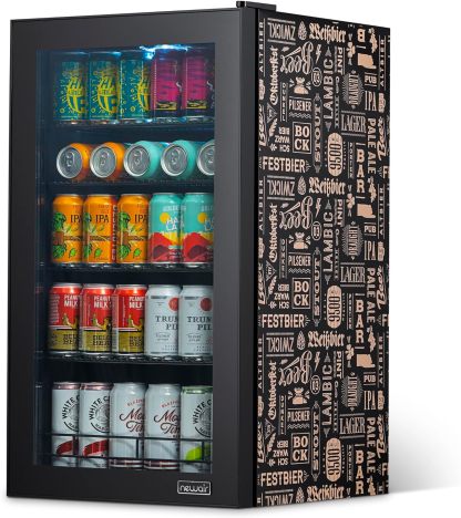 NewAir - Refrigerador de bebidas con capacidad para 126 latas - Minibar de cerveza con puerta de cristal, bisagra derecha - Enfría hasta 34 °F (1 °C) - AB-1200BC1 - Diseño de Cervezas del Mundo-Muñeca