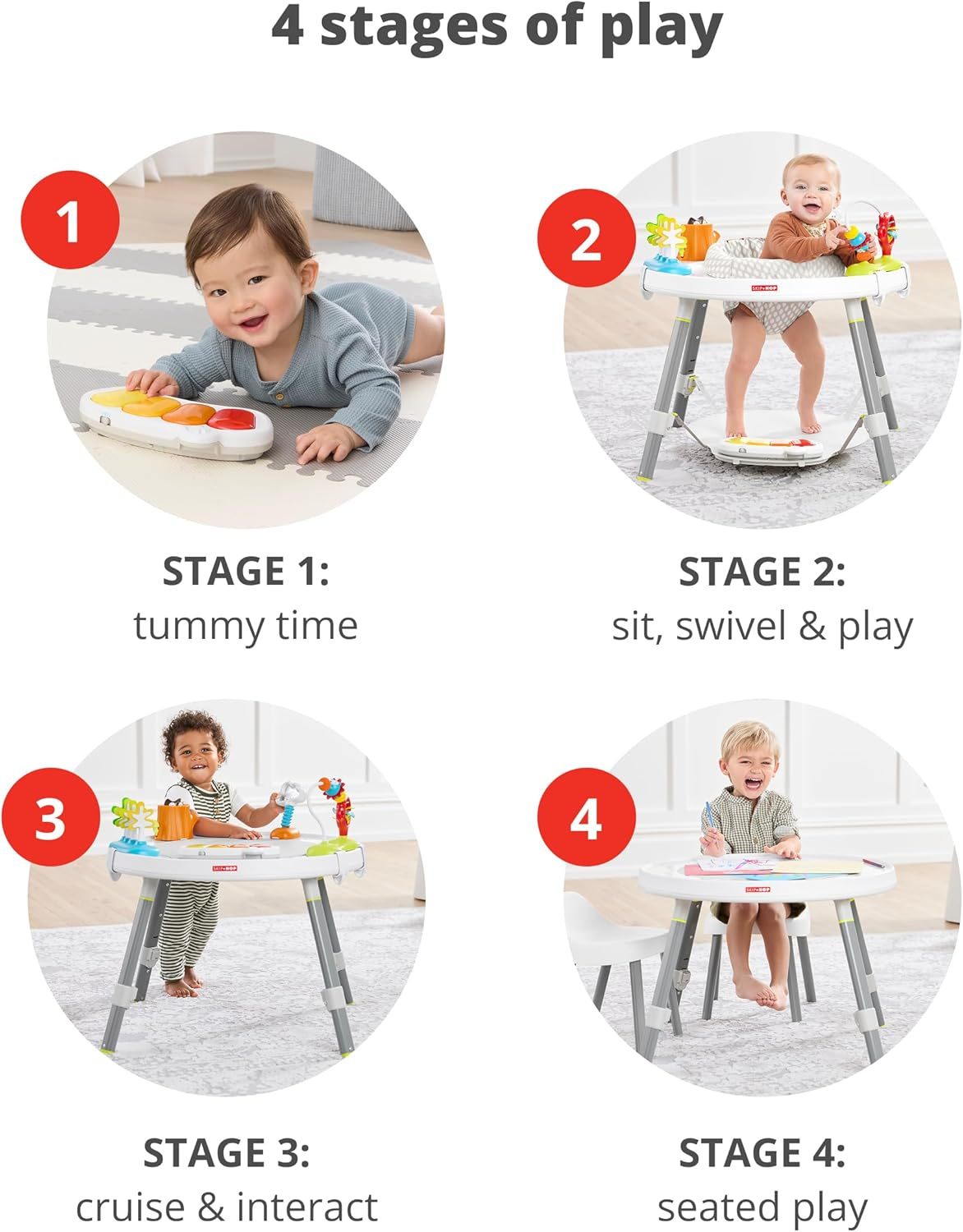 Nuestro moderno centro de actividades cautiva a los bebés de pies a cabeza desde los cuatro meses hasta los más pequeños