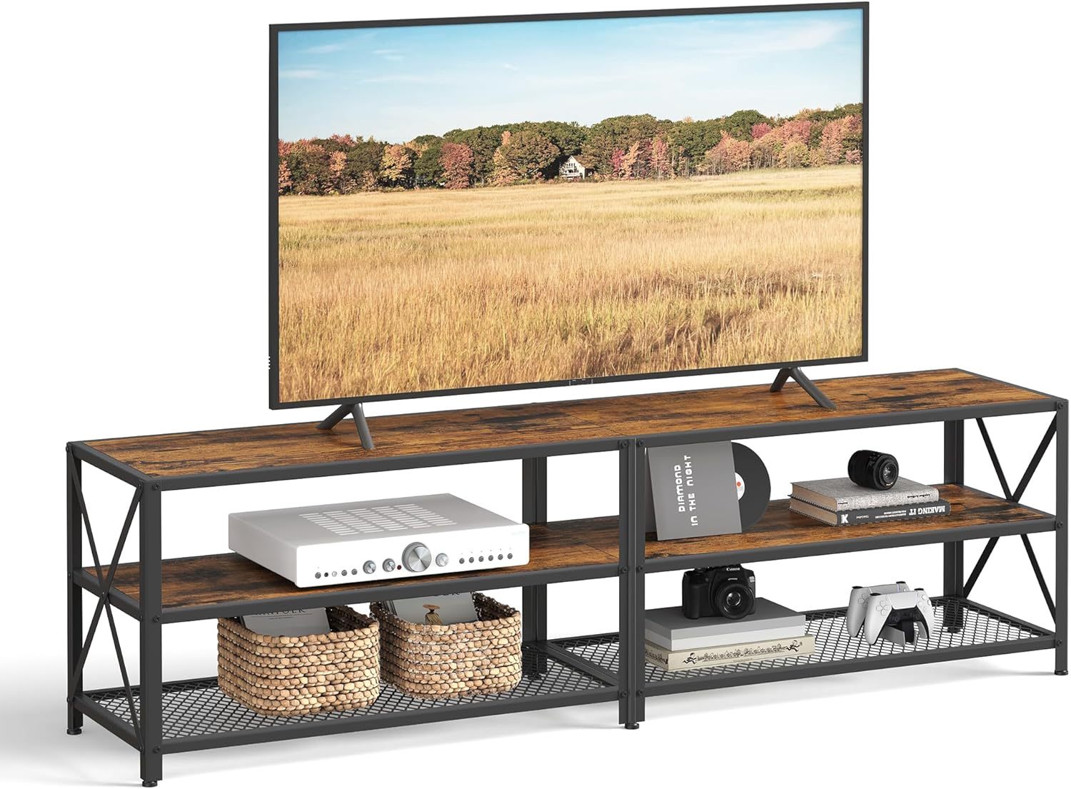 VASAGLE Mueble de TV, Mesa de TV para Televisores de hasta 75 Pulgadas, Ancho 178 cm, Marco de Acero, con Estantes, para Salón, Dormitorio, Marrón Rústico y Negro MLTV096B01