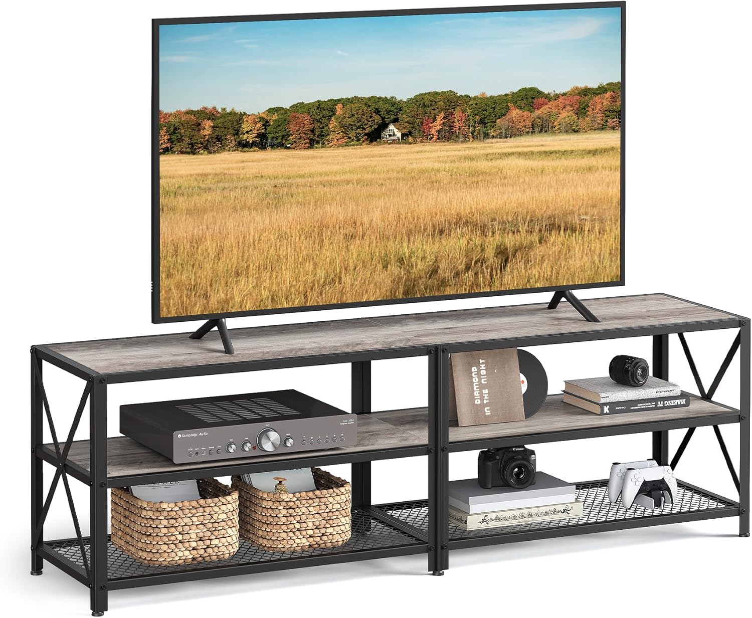 • 【AMPLIO ESPACIO】 Esta mesa de TV con tres estantes ofrece un amplio espacio. Coloca el mando a distancia en la parte superior, guarda los DVD y la consola de juegos en el estante central y almacena los libros y revistas en el estante de malla inferior