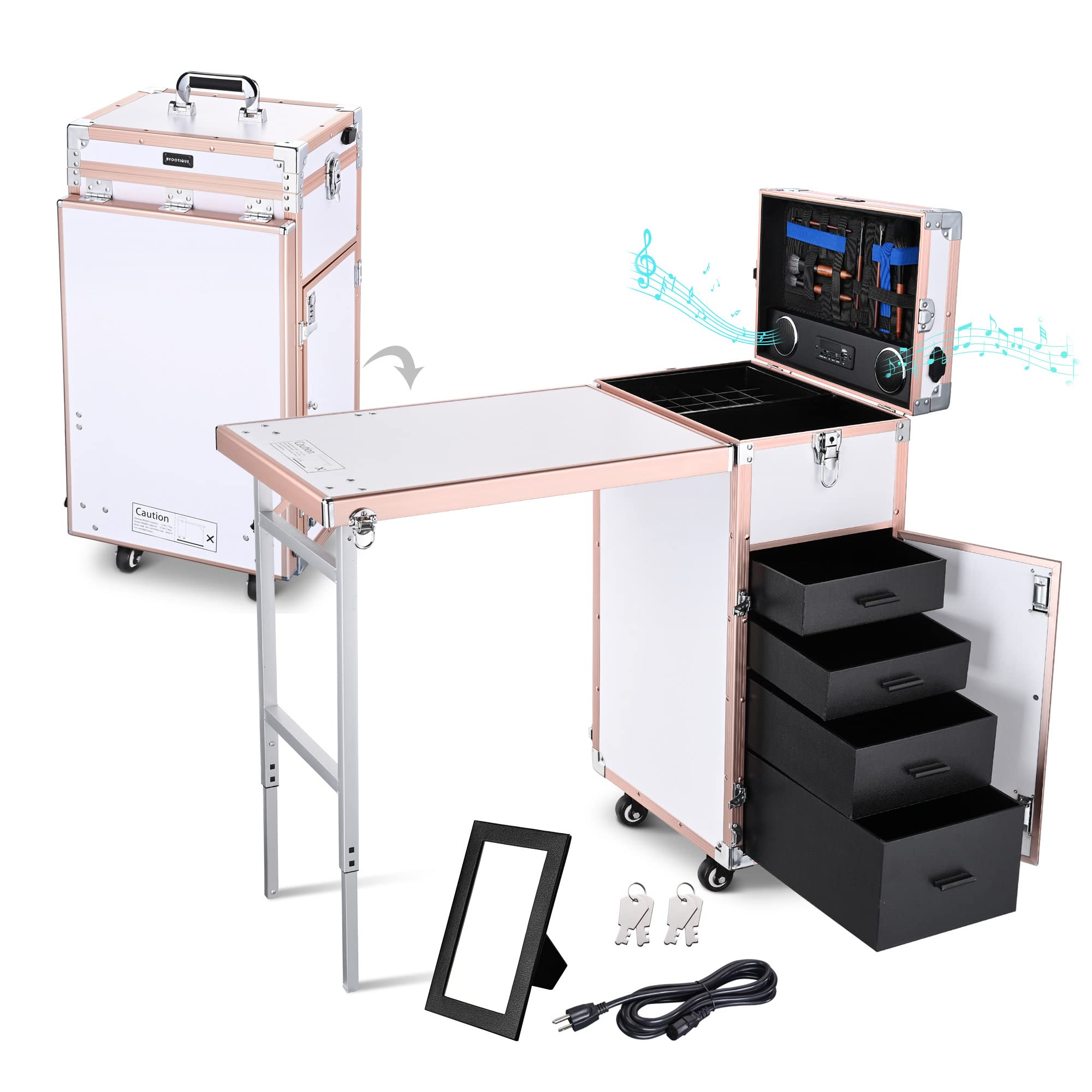 - Seguro y a salvo:Cuenta con pestillos con llave en la cubierta y cerradura con contraseña en la puerta para proteger cosméticos y objetos de valor;Los pestillos de la mesa mantienen la mesa firme.