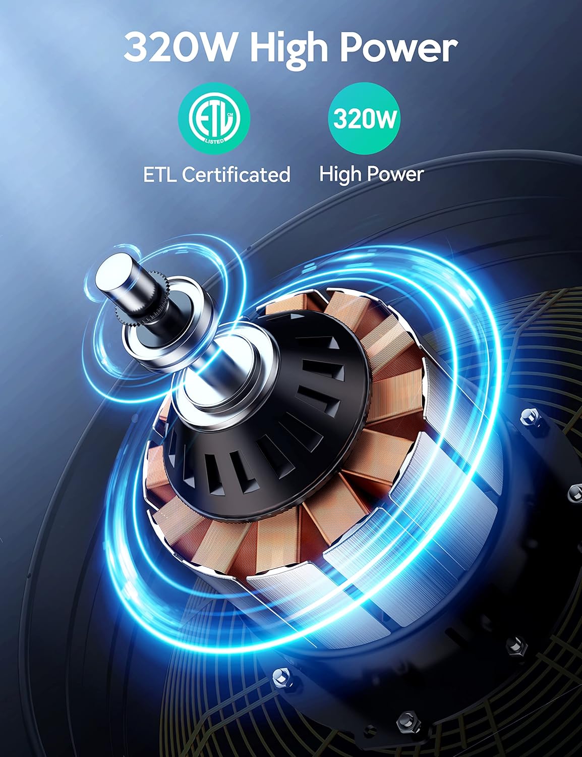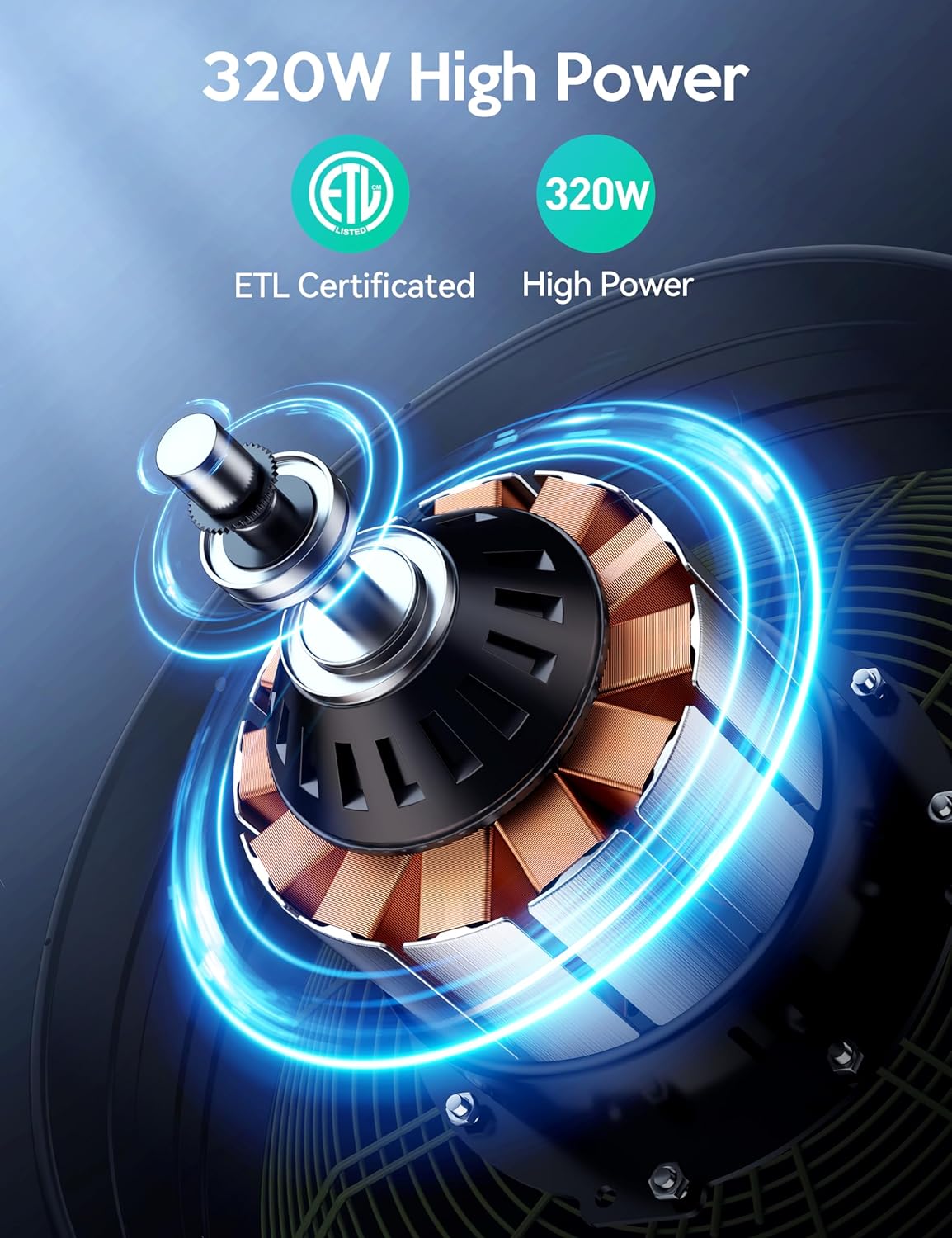 Potente fuerza del viento: Equipado con un motor de 320W, este ventilador produce un viento fuerte y de gran alcance que puede enfriar eficazmente grandes espacios.