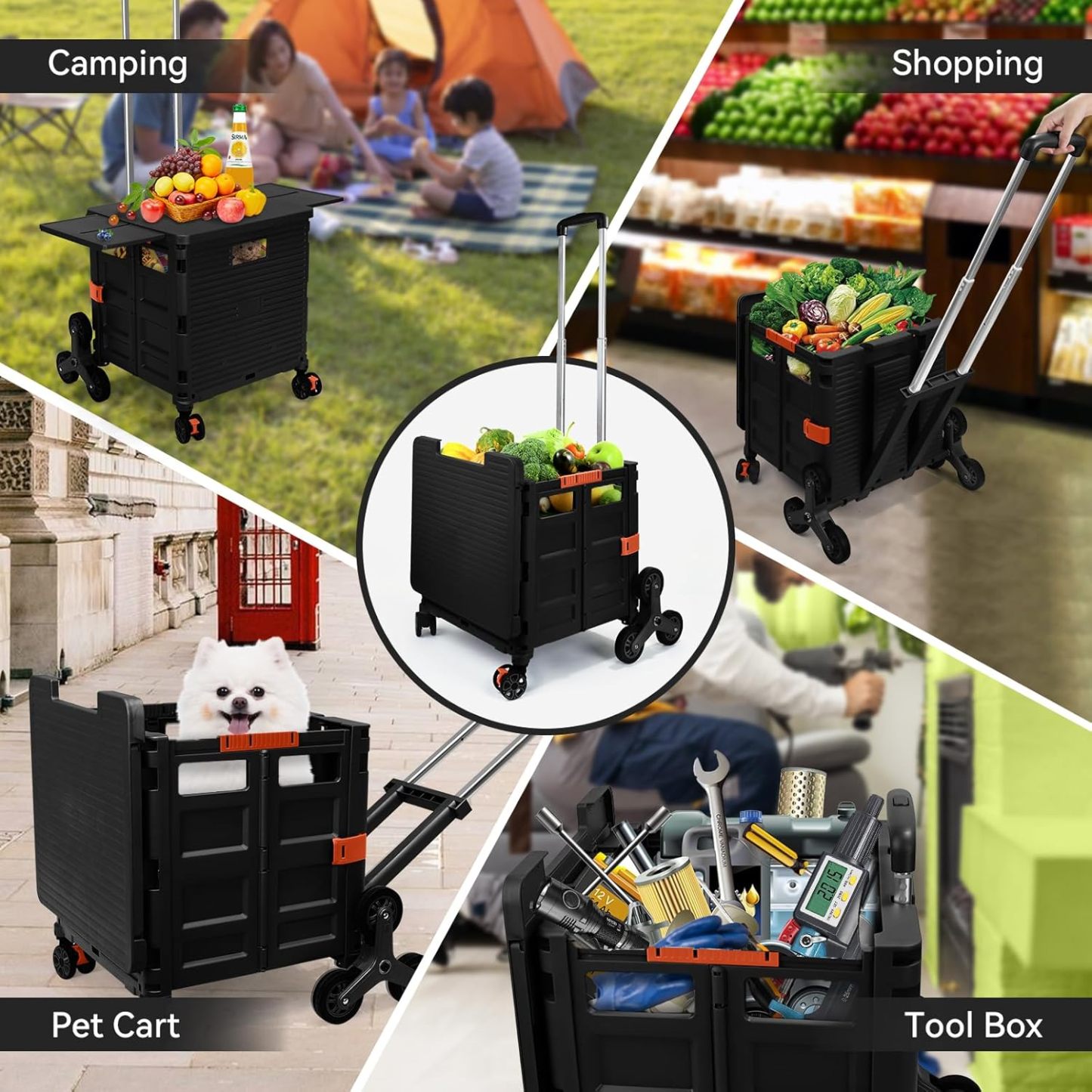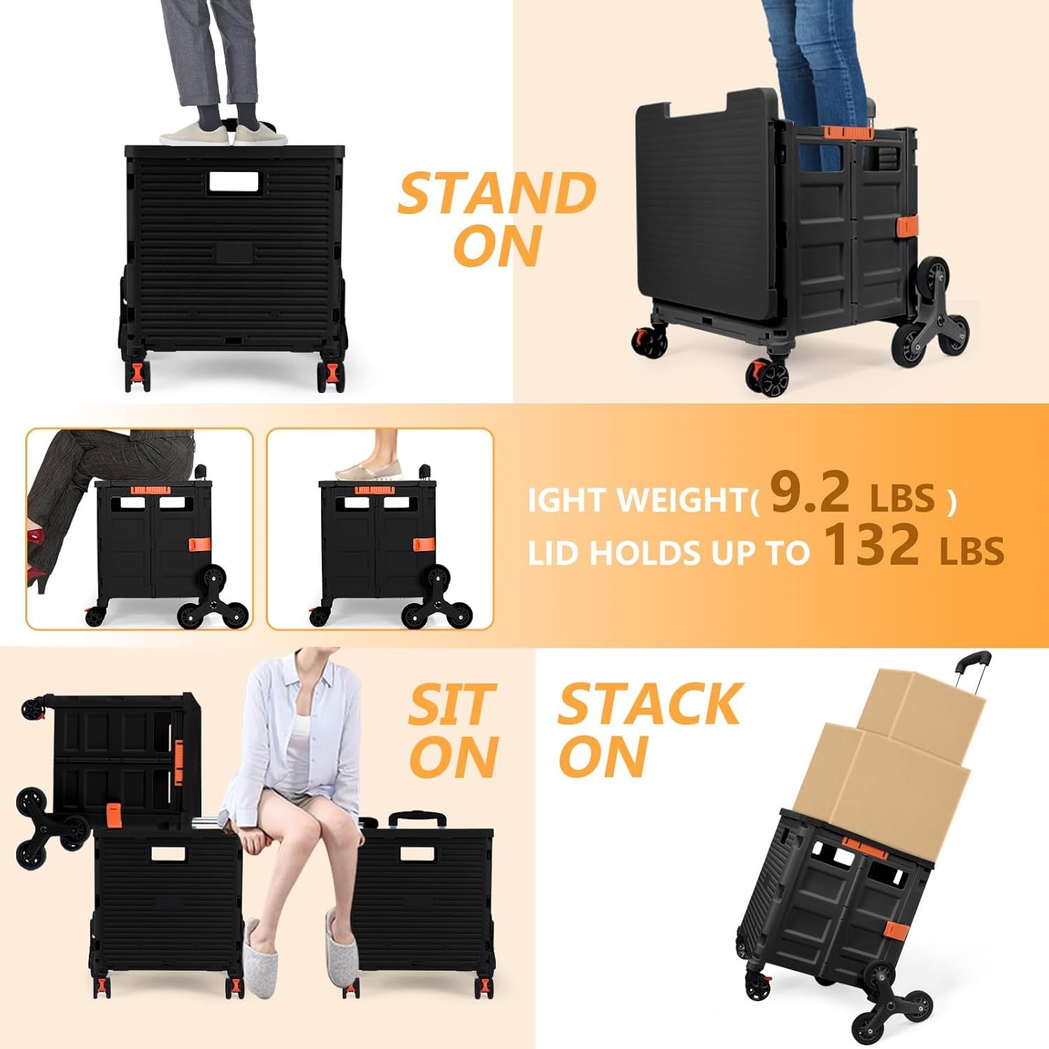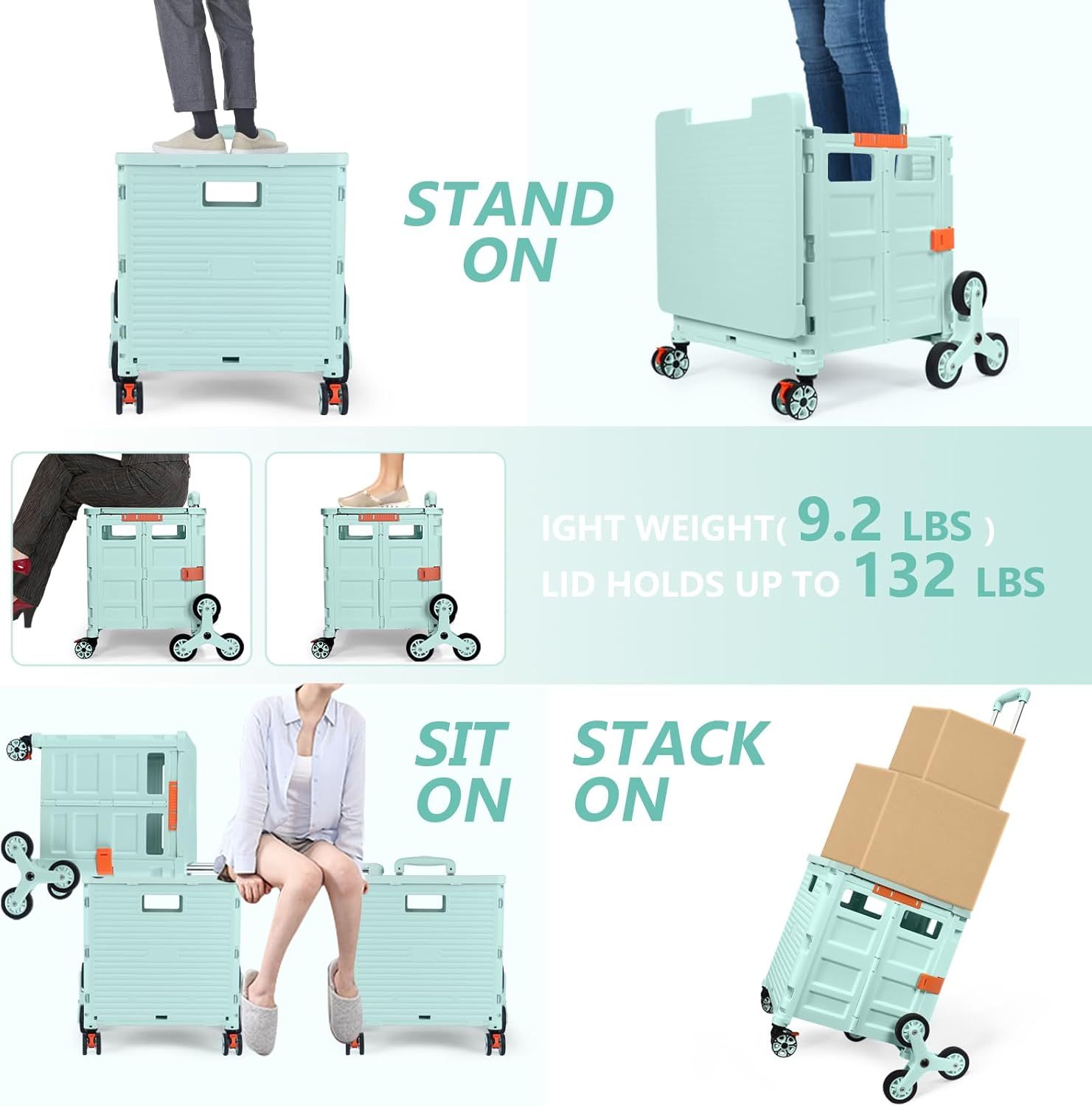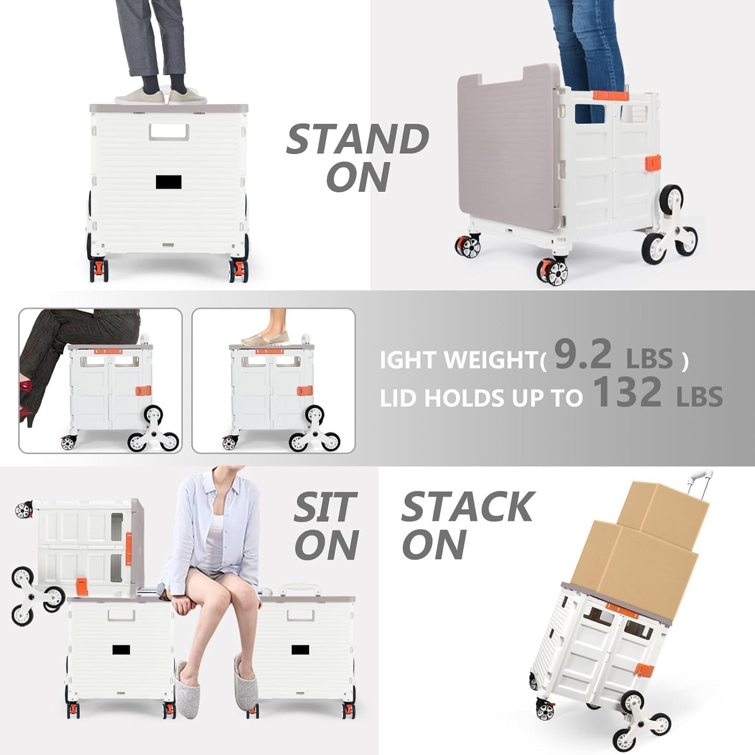 - 【Increíble capacidad de carga y ultra grande】Nuestro carro plegable puede contener 55 L de mercancías, el peso pesado del carro de mano puede alcanzar 175 libras, el peso pesado del mango telescópico de aleación de aluminio a prueba de óxido puede alcanzar 125 libras, según una serie de pruebas prácticas, los carros rodantes tienen un buen rendimiento de carga. Creo que este es un excelente carrito de herramientas para mover comestibles y almacenamiento de libros de oficina, para que nunca tengas que preocuparte por el peso de nuevo.