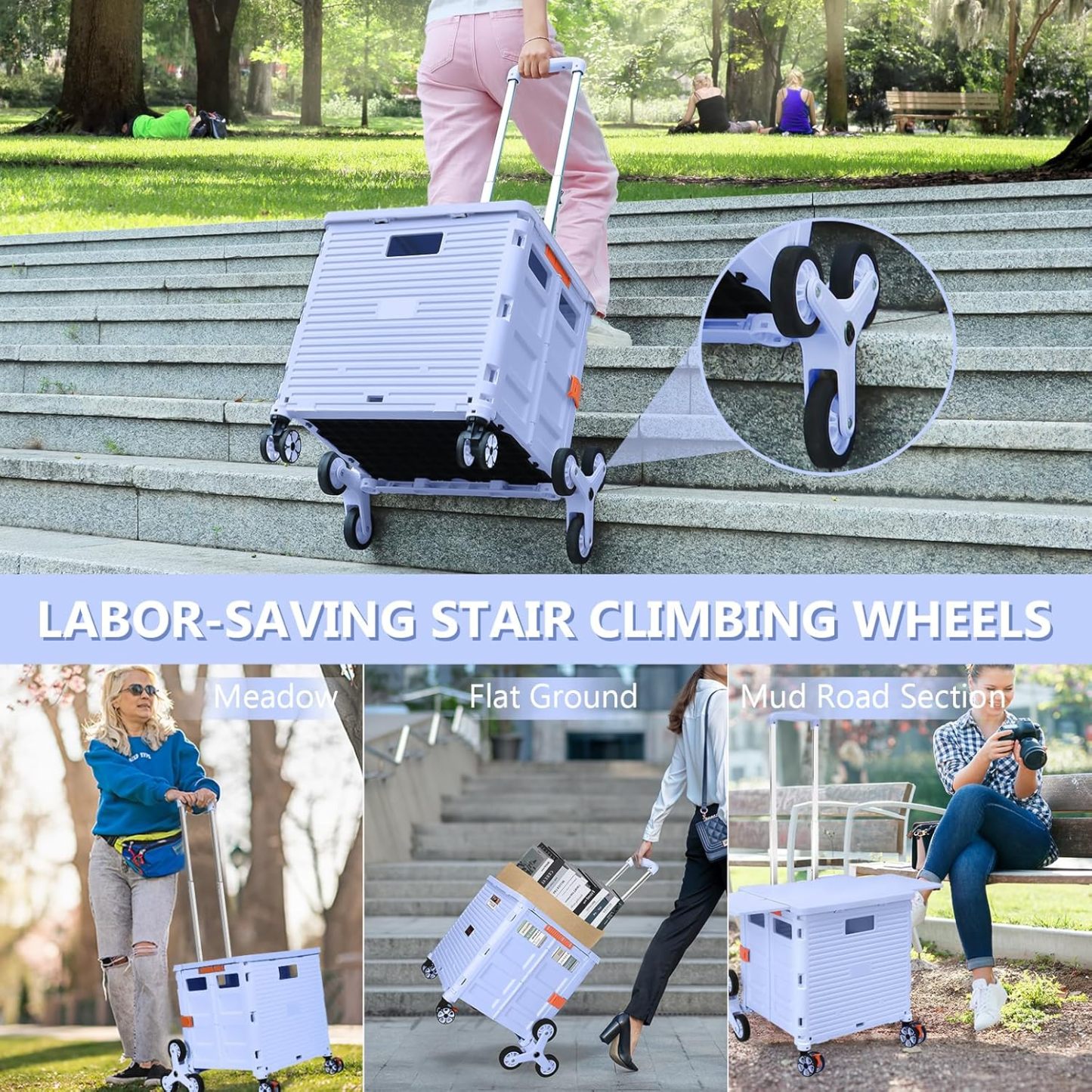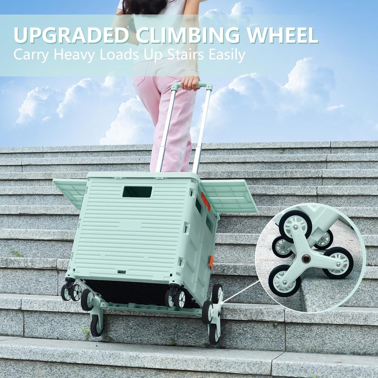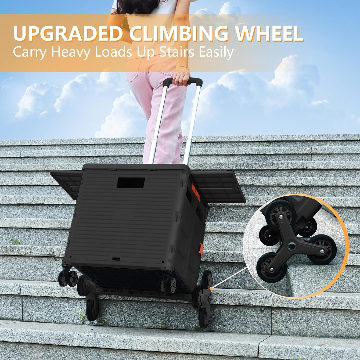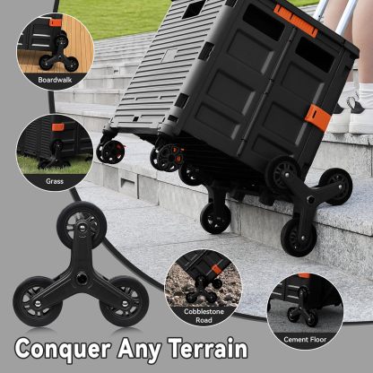 - Ruedas delanteras giratorias de 360° y ruedas de escalada de escalera: equipamos nuestro carrito plegable con 6 ruedas de escalada de escaleras y 2 ruedas giratorias sin ruido de 360° con frenos. Las ruedas de goma TPE mejoran la resistencia al desgaste, lo que te permite experimentar una maniobrabilidad óptima, por lo que es más fácil llevar cargas pesadas hasta escaleras y girar y cambiar fácilmente de dirección en cualquier golpe.